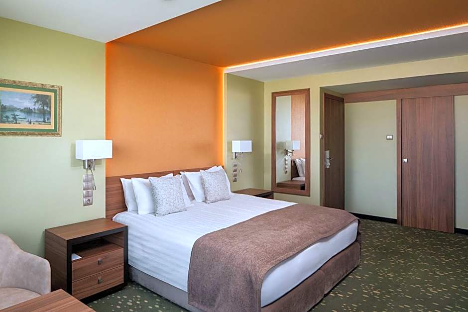 The air-conditioned room with floor-to-ceiling windows offers scenic views of the Danube River. It features an LCD TV with satellite channels, a safety box and a private bathroom.